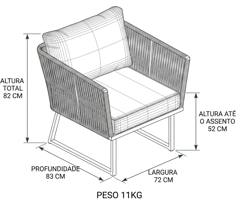 A estrutura em alumínio oferece durabilidade e excelente desempenho para o uso diário, enquanto a corda náutica traz textura, personalidade e um acabamento visual que conversa com projetos contemporâneos e acolhedores. O estofado complementa a experiência com conforto e praticidade, criando um equilíbrio entre estética e funcionalidade.